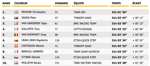 Interesting fact: Peter Sagan finished in 46th, almost 2 minutes faster than Porte. No matter, I'm excited at the possibility that next year he'll be in the black and red of Team BMC. He still showed well throughout the tour shepherding Froome. You can't buy loyalty like that.