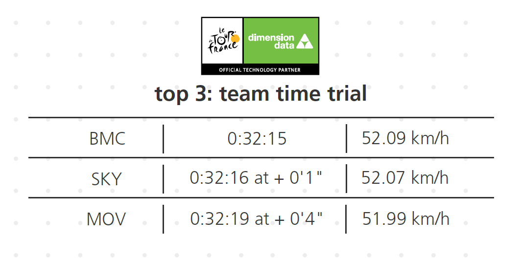 The real revelation, Movistar. You look at that roster and aside from Alex Dowsett and Adriano Malori, you are pressed to find a time trial specialist. And yet, they finished 4 seconds off the pace. Impressive. Very impressive. They put Quintana in a very good position coming into the mountains.